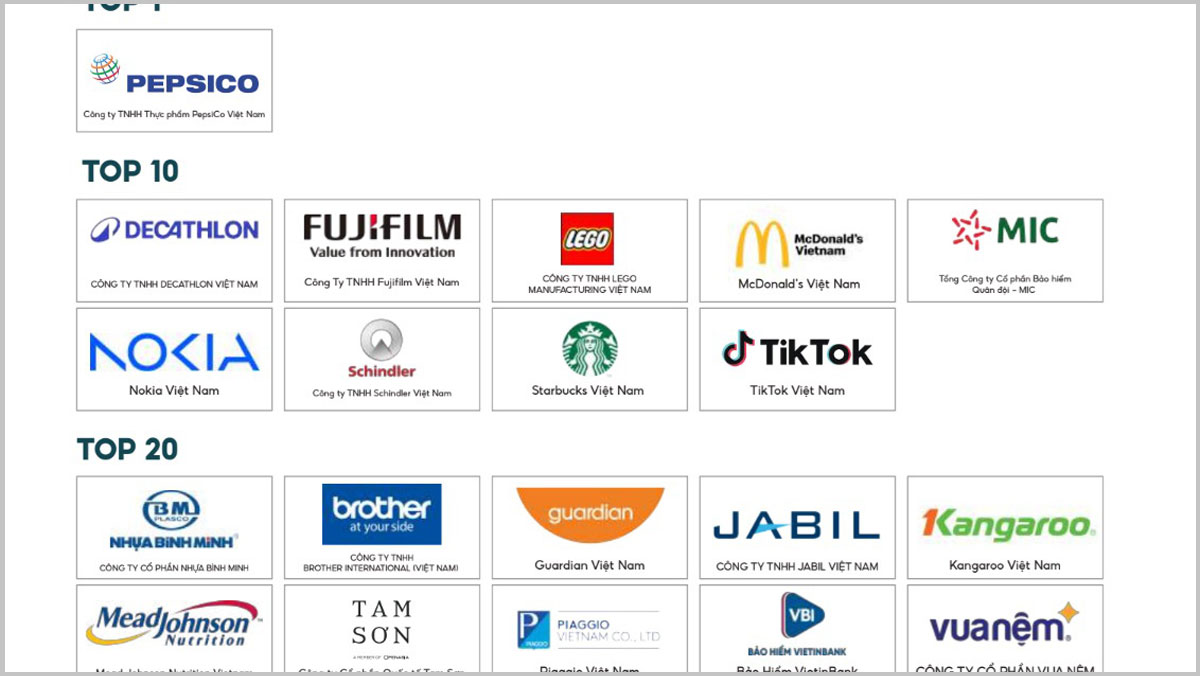Bảng xếp hạng tôn vinh top 100 nơi làm việc tốt nhất Việt Nam ở khối doanh nghiệp lớn và top 100 nơi làm việc tốt nhất Việt Nam ở khối doanh nghiệp vừa.